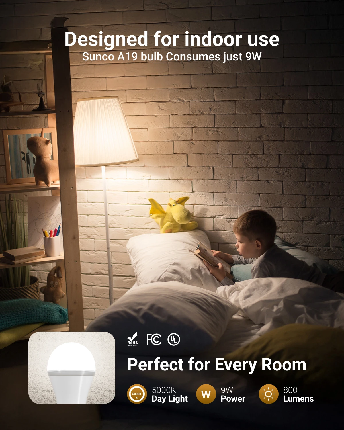 The A19 LED Bulb by Sunco has instant start up with no warm up. Safe for home, museum artwork (no UV), and more.