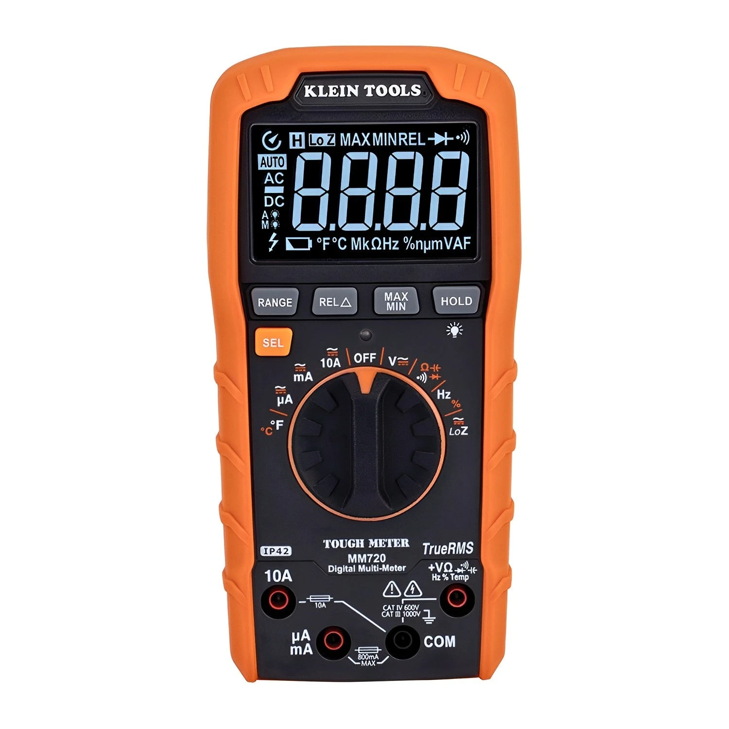 The Klein Tools Digital Multimeter is a versatile tool designed to meet the demands of professionals and hobbyists. With True RMS auto-ranging technology, it delivers accurate measurements up to 1000V AC/DC, 10A current, and 60 MOhms resistance, making it ideal for a variety of tasks. This multimeter tester also measures temperature, capacitance, frequency, low impedance, duty cycle, test diodes, and continuity—offering comprehensive diagnostic capabilities. Its Low Impedance (LoZ) mode ensures reliable readings by eliminating ghost voltages. Built tough to withstand drops of up to 6.6 feet, it features a low battery indicator and an easy-access battery and fuse compartment. With a CAT IV 600V safety rating, this electrical tester is ideal for residential, commercial, and industrial projects.