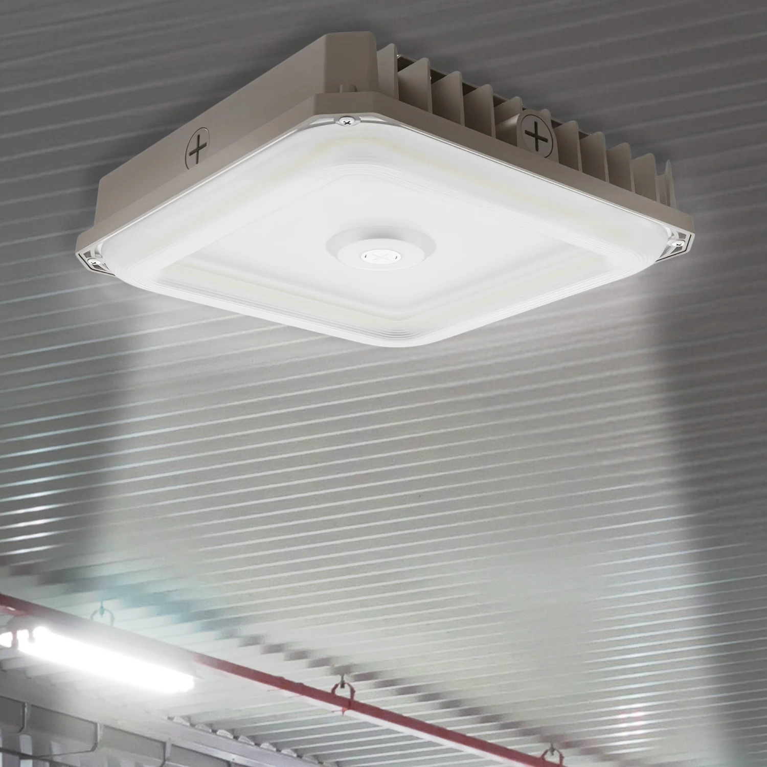 Elevate your outdoor lighting with the LED Canopy light fixture offering customizable settings and exceptional performance. This gas station canopy light features tunable wattages that can deliver up to 13,500 lumens, perfect to brighten large spaces. It boasts 3 color temperature switches that let you fine-tune the mood, whether you want a warm, inviting glow or a bright, vibrant light. Designed for durability, it ensures consistent performance in outdoor environments thanks to its wet rating and robust housing. Plus, an optional sensor with motion detection and dusk-to-dawn operation is available for added convenience and energy savings. Install this outdoor canopy fixture for reliable lighting in any condition.