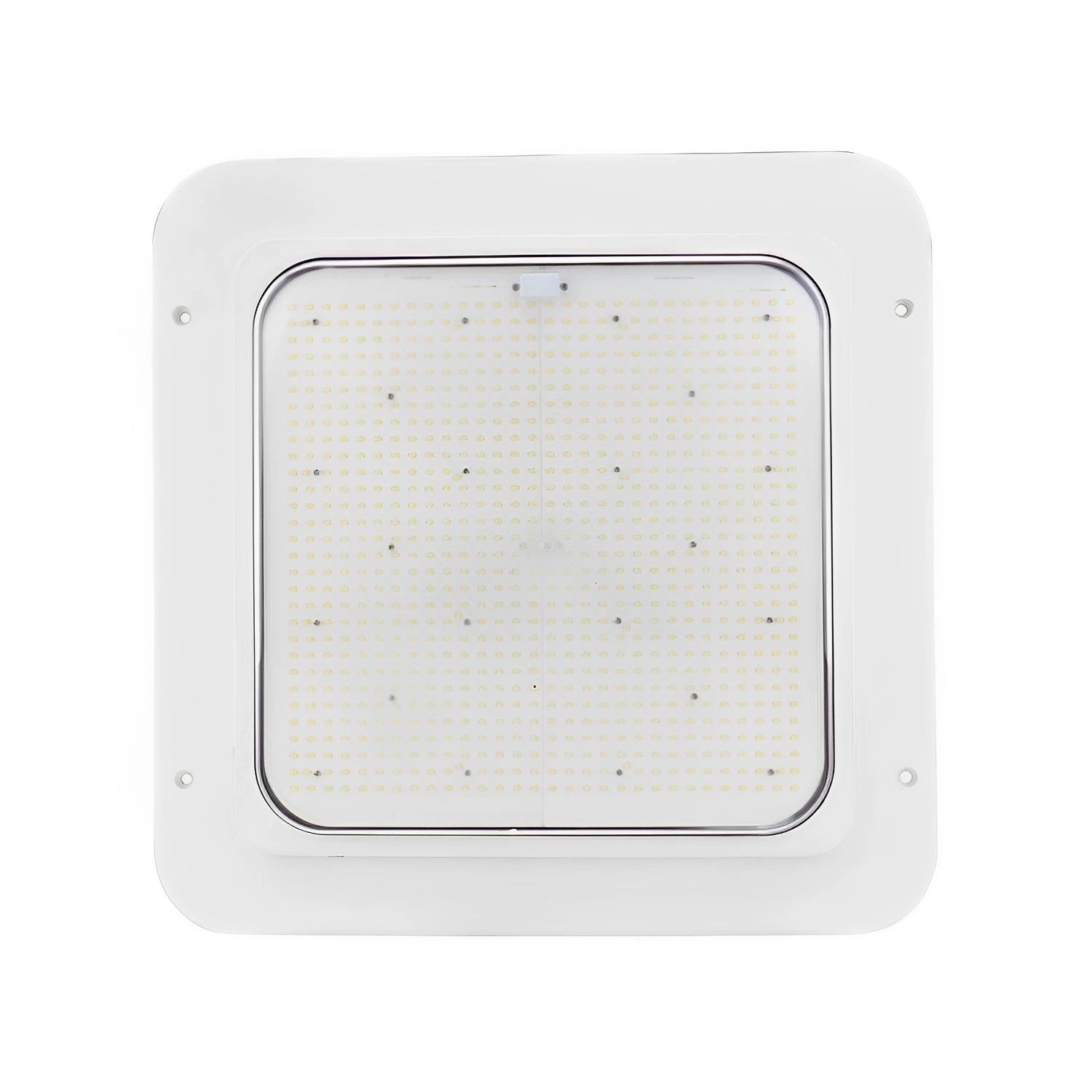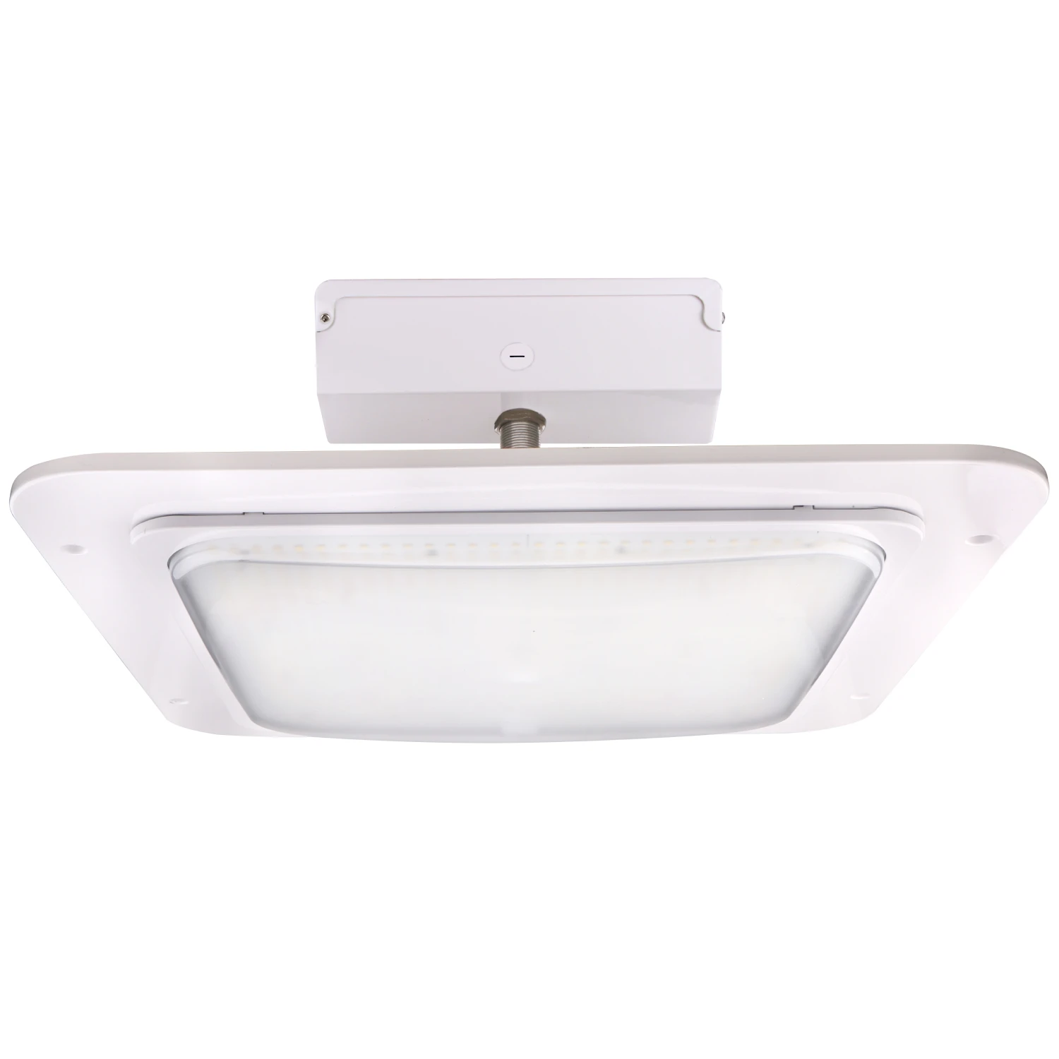 Replace your outdated metal halide or high-pressure sodium lamps with the LED Canopy Light. This close-to-ceiling light fixture delivers an impressive 33600 lumens, perfect for brightening outdoor areas such as gas stations, parking lots, and more. Consuming only 240W, it offers substantial energy savings compared to its traditional counterparts. It features a 5700K color temperature, mimicking natural daylight for enhanced visibility. The aluminum housing, finished in white, ensures efficient heat dissipation and a clean look. Mounting options include ceiling or conduit pipe pole installation for versatile installation. Plus, a conveniently located J-box simplifies both installation and future maintenance. Install this reliable and efficient outdoor canopy LED that outperforms traditional lighting solutions.