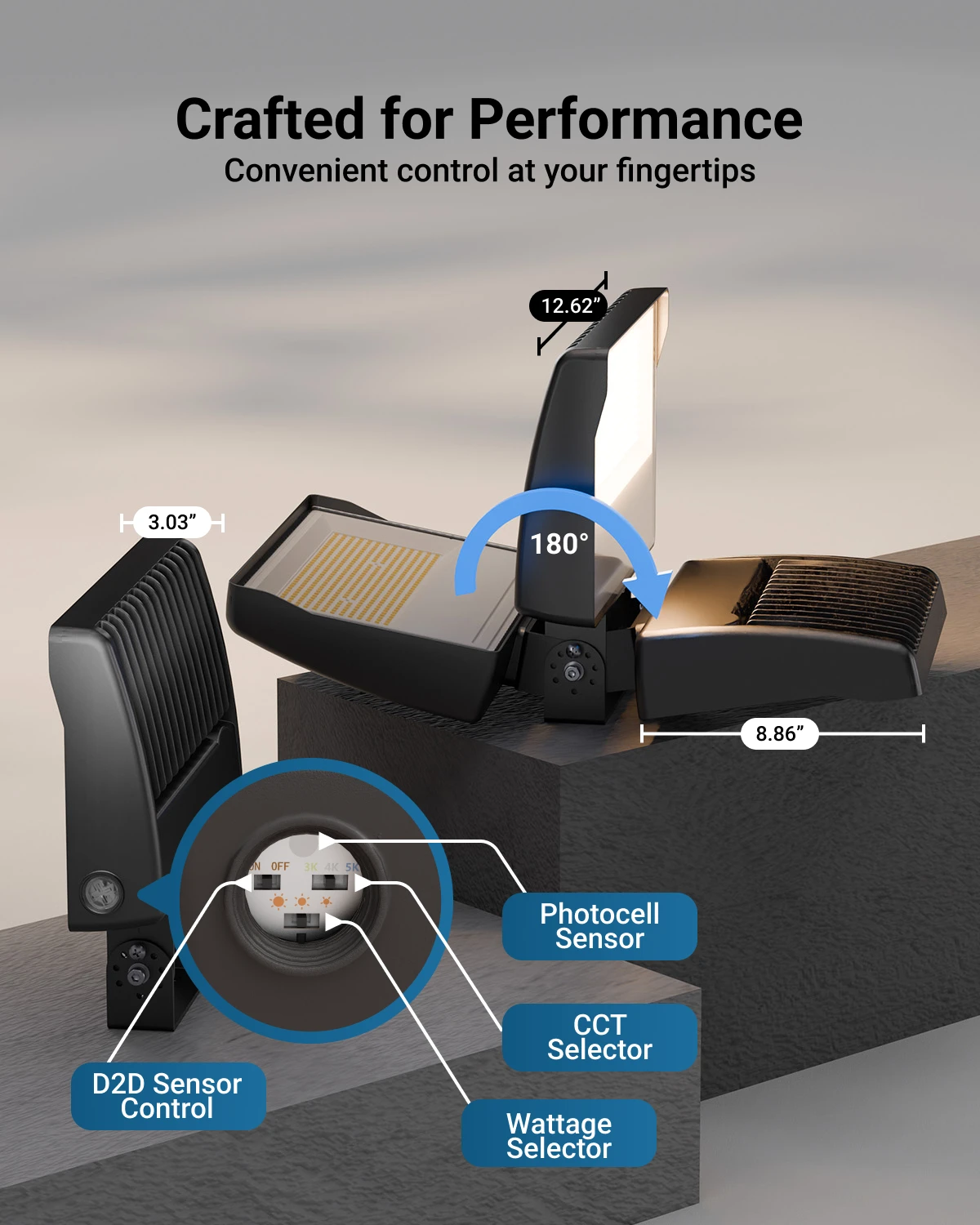 Adjustable yoke to mount on wall or ground. D2D sensor offers auto on and off.
