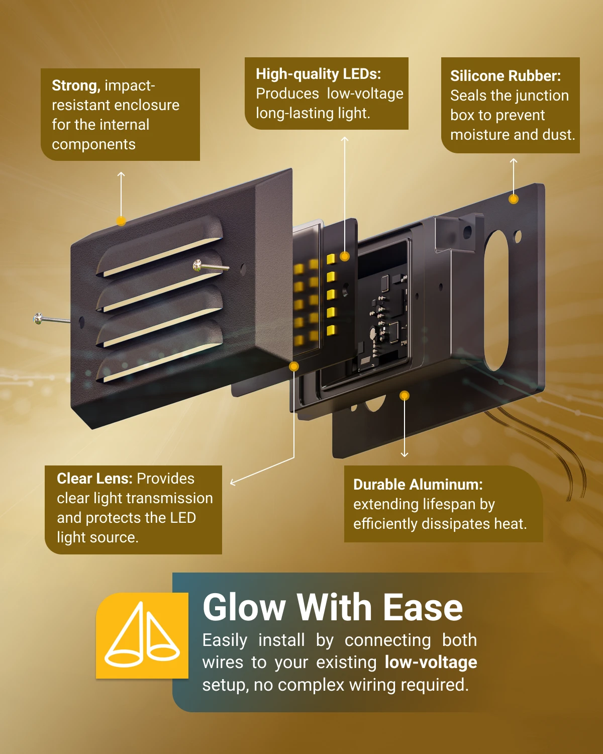 Impact resistant, low voltage, and long lasting LED Outdoor Step Lights.