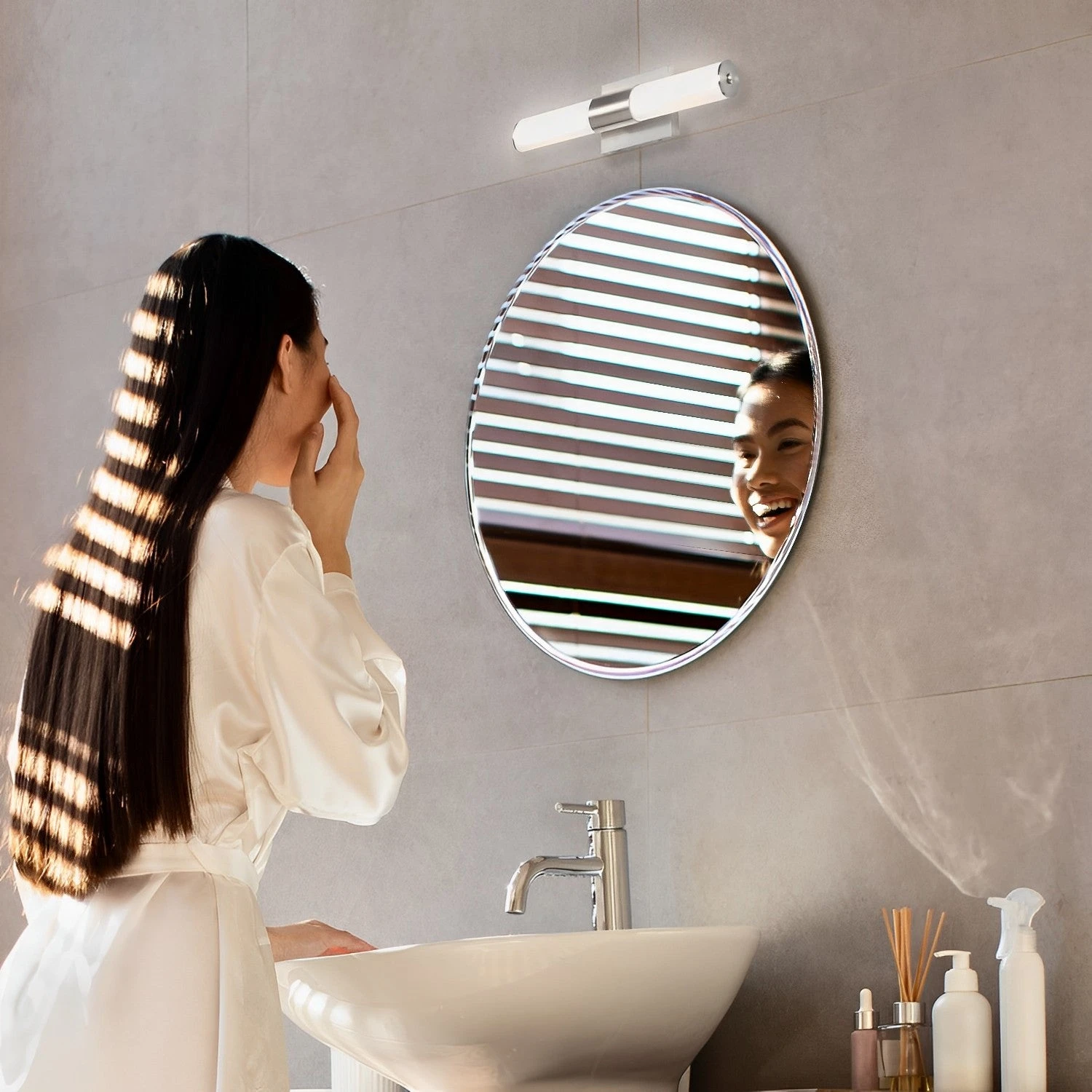 The LED Satin Nickel Vanity Light fixture brings elegance to your home with a striking backplate and acrylic shade. Perfect for bedrooms, bathrooms, or entryways, this vanity sconce delivers ample lighting with up to 1520 lumens using 17W power. It features selectable color temperatures that allow you to customize the ambiance to any setting from cozy to a brighter, more energizing atmosphere. The durable steel construction ensures longevity and a polished look, complemented by the satin nickel finish that suits any décor. Plus, the acrylic shade distributes light evenly and eliminates glare, making it ideal for residential applications. Upgrade your home’s lighting with this wall light fixture.