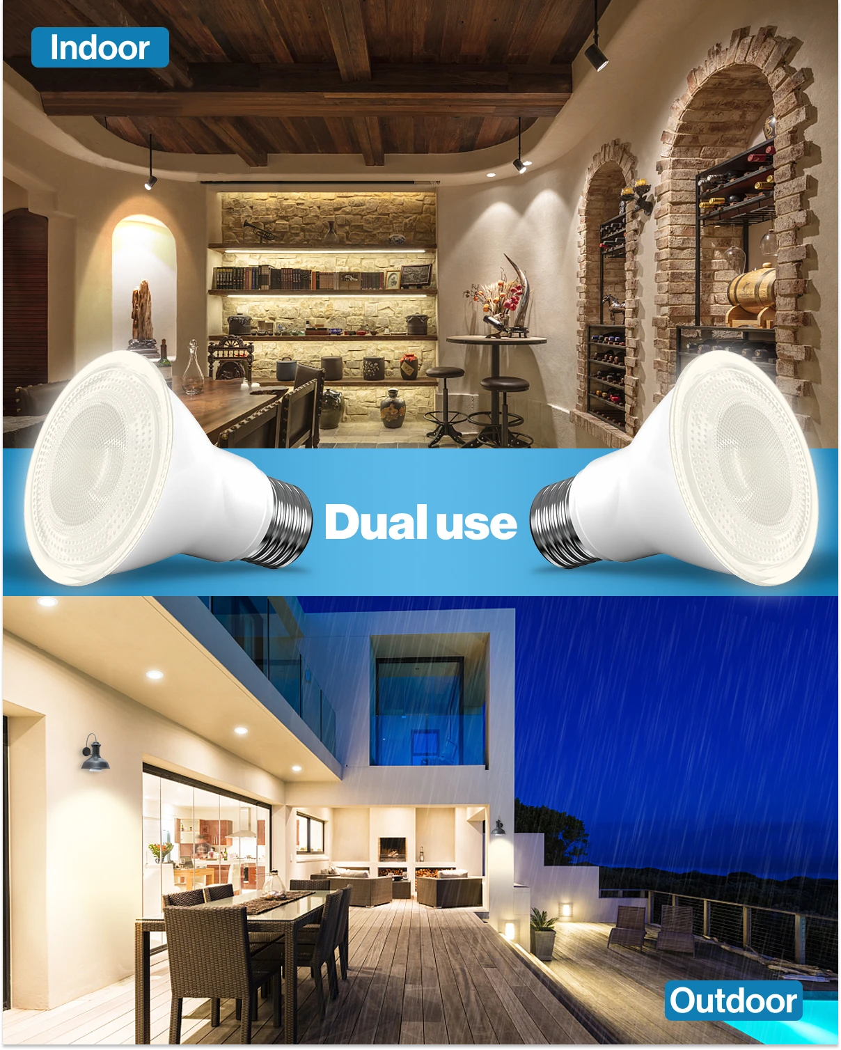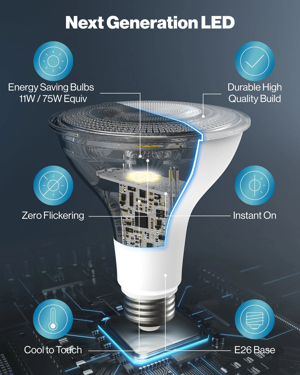 High Brightness – 1200 lumens. 11W PAR30 LED equivalent to 75W. Waterproof and dimmable.