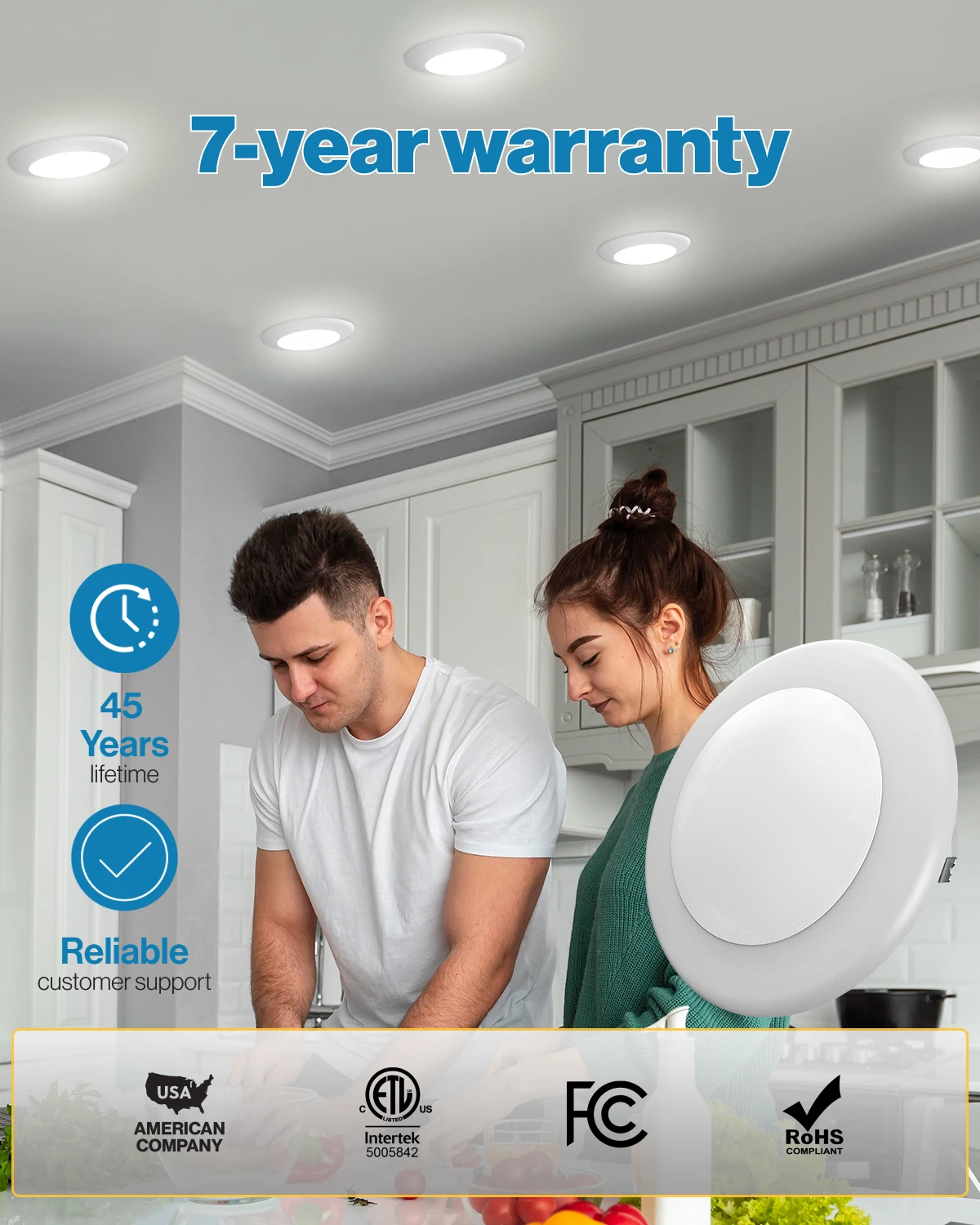 Dimmable with a high CRI90+ and easy-to-install, retrofit or surface mount, the 10W Sunco Recessed LED Lighting, 4-Inch, Disk