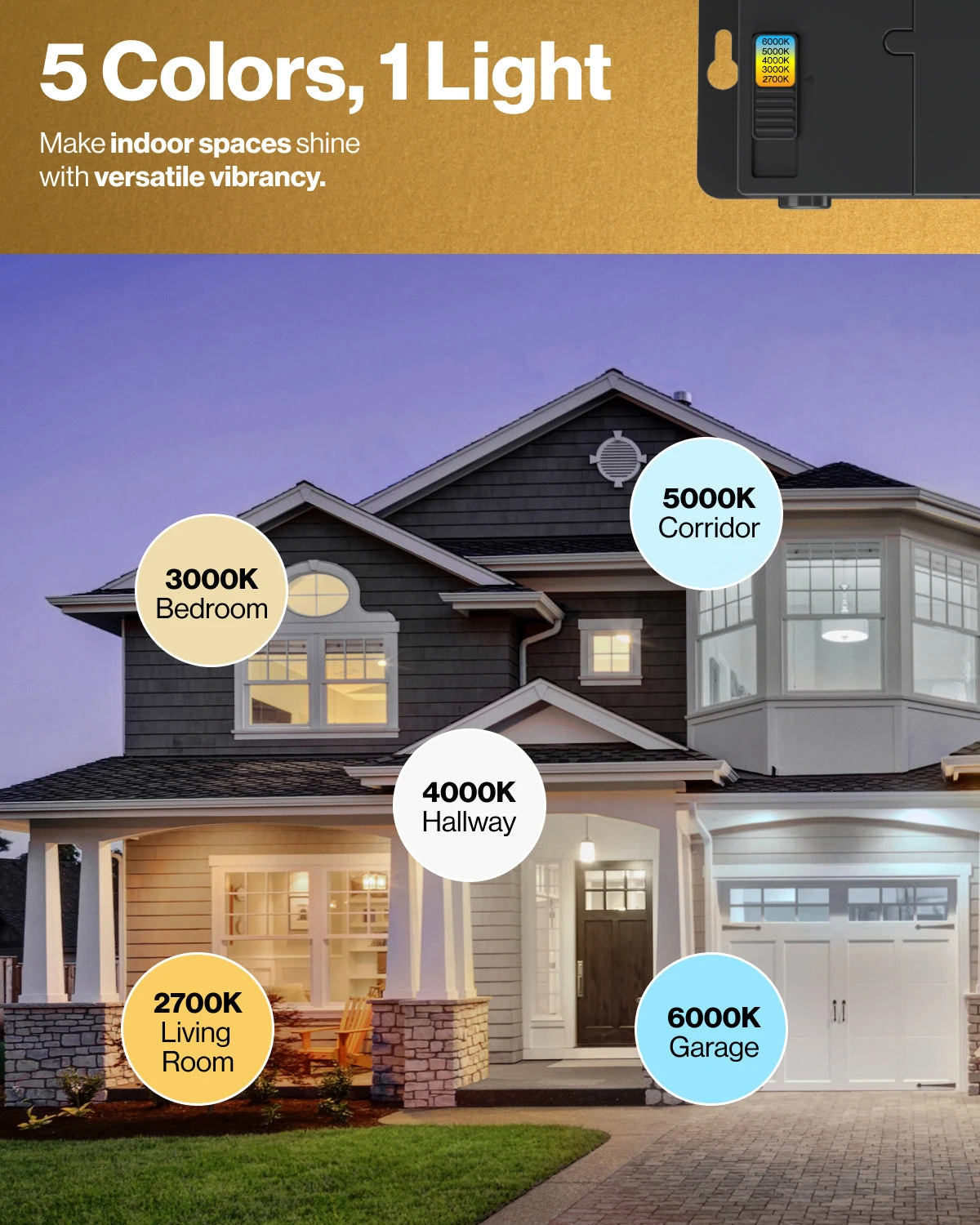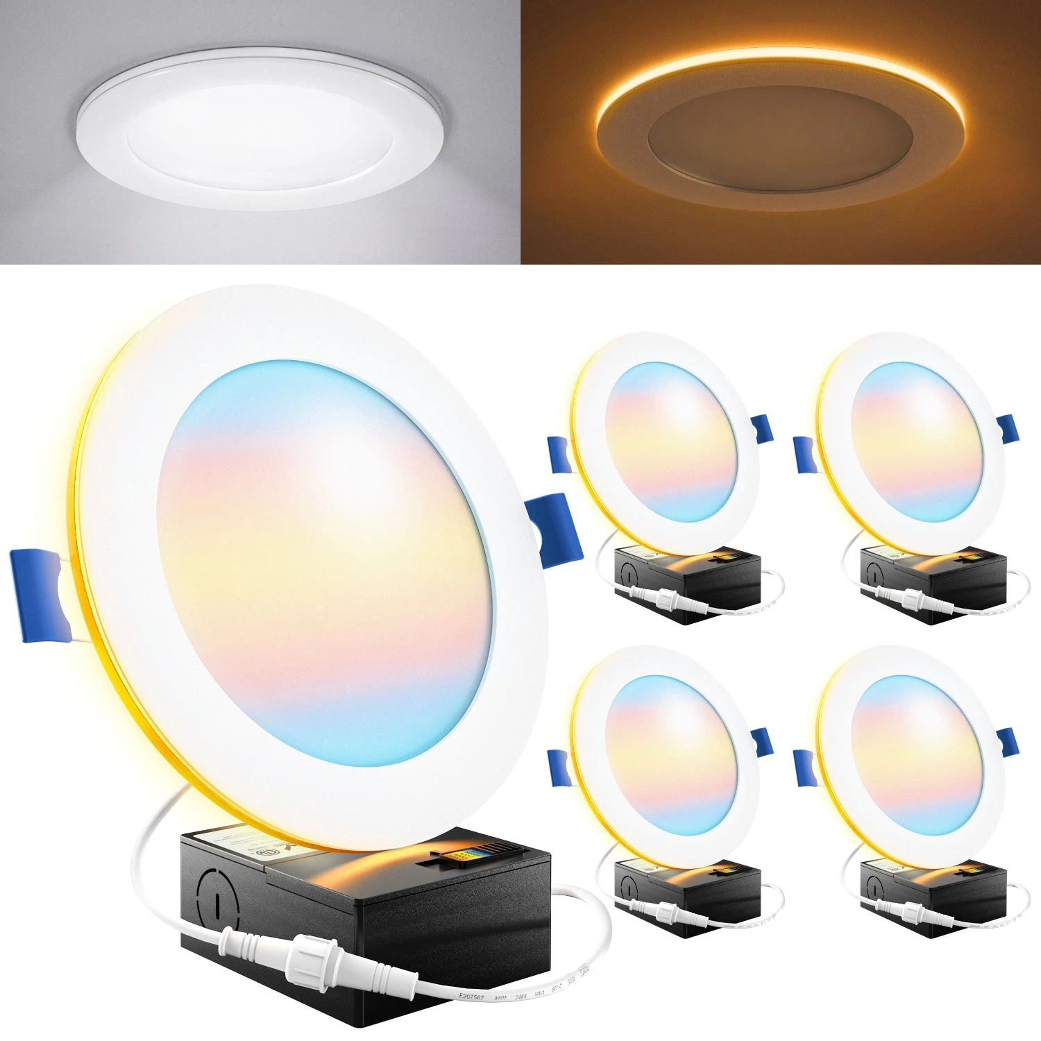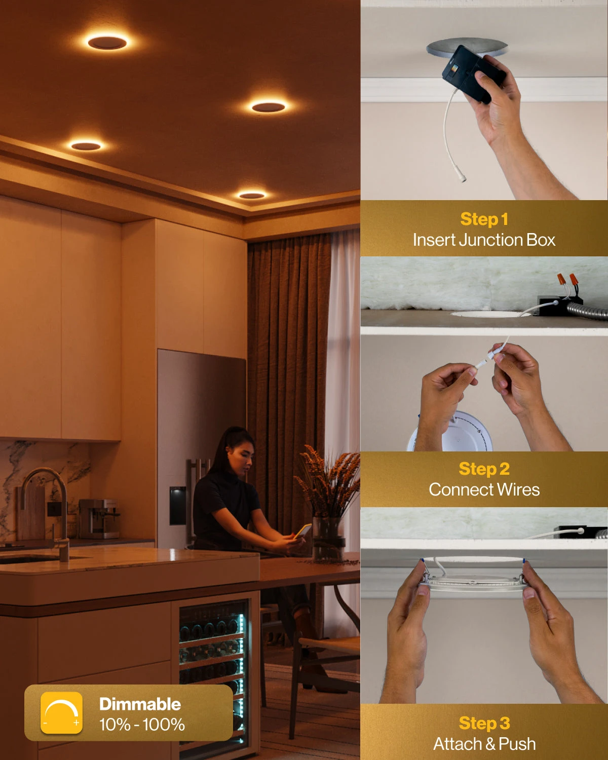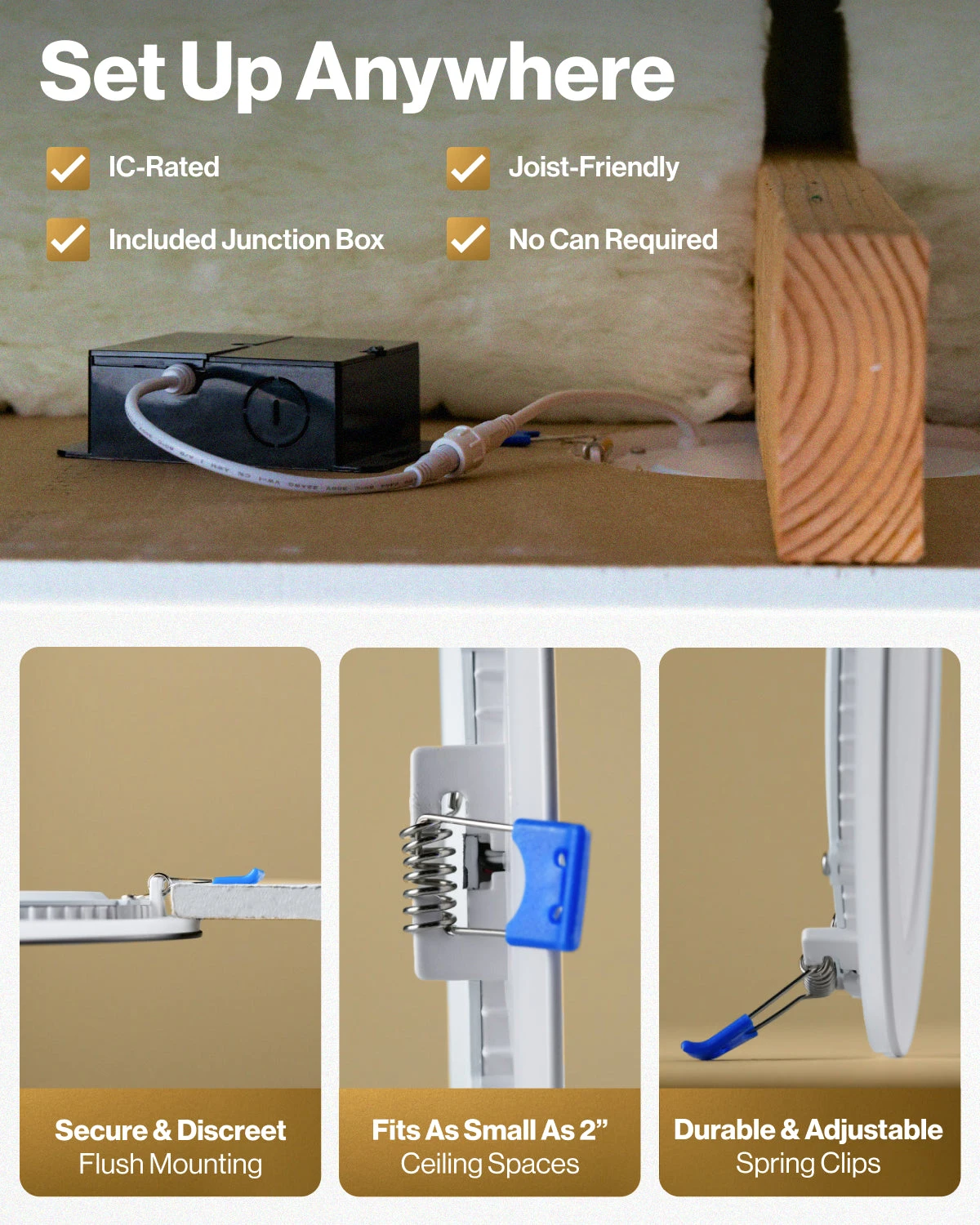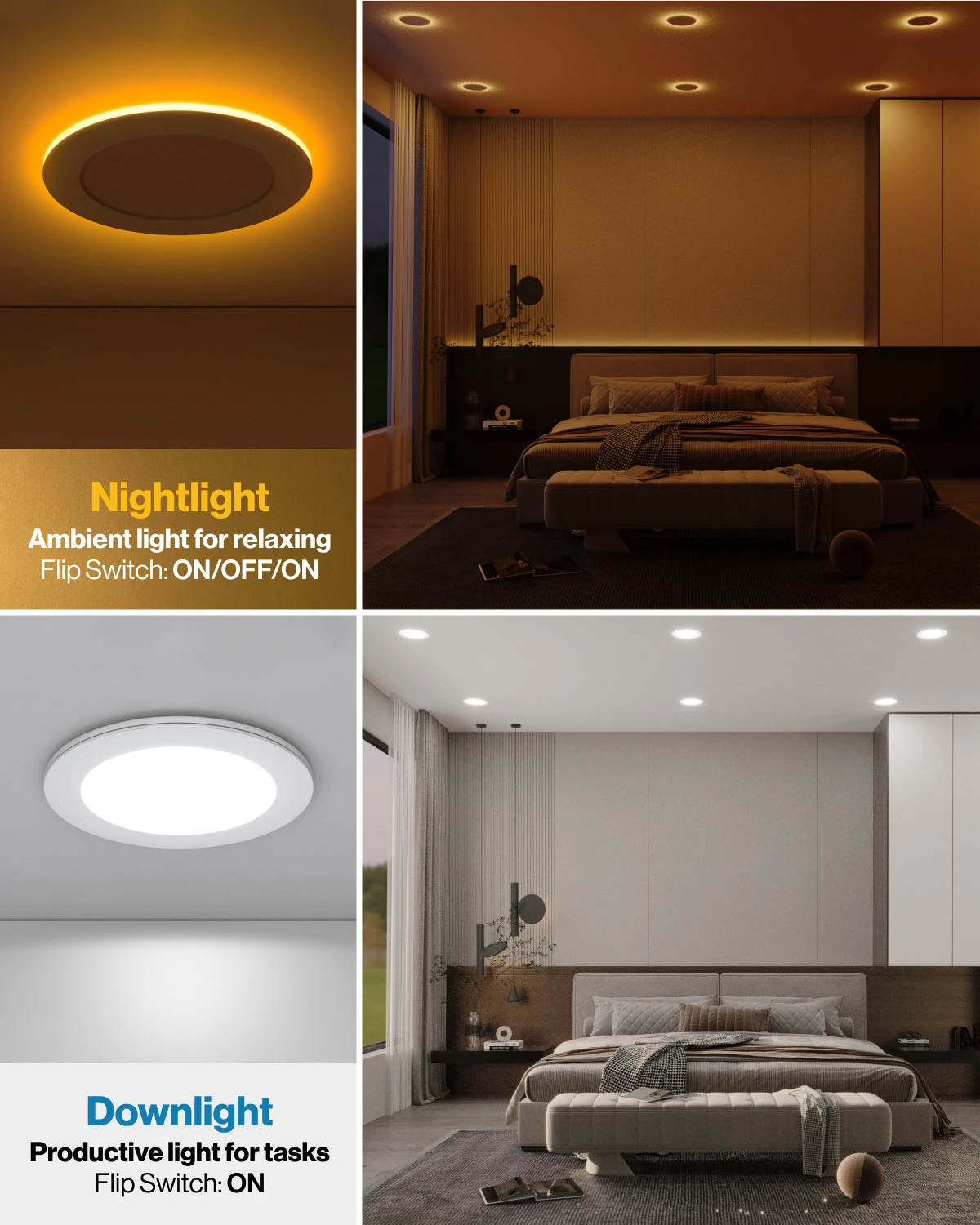 Recessed LED Light with integrated night ambient light. IC rated for fire safety. Fast install with all in one package. No can needed. Selectable Color Temperature.