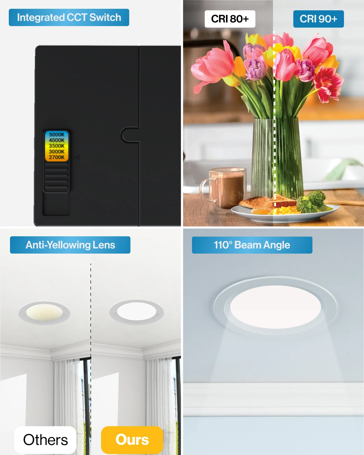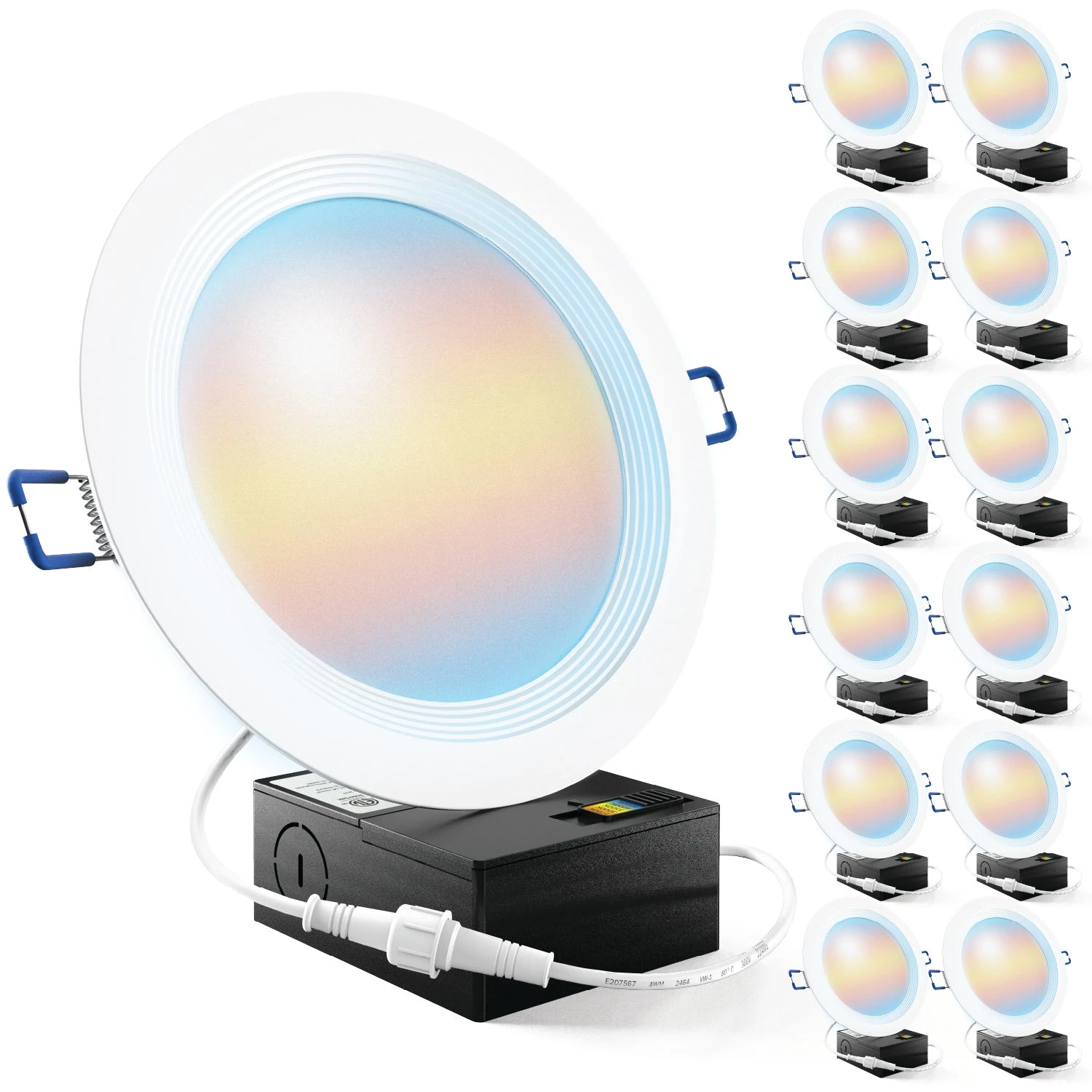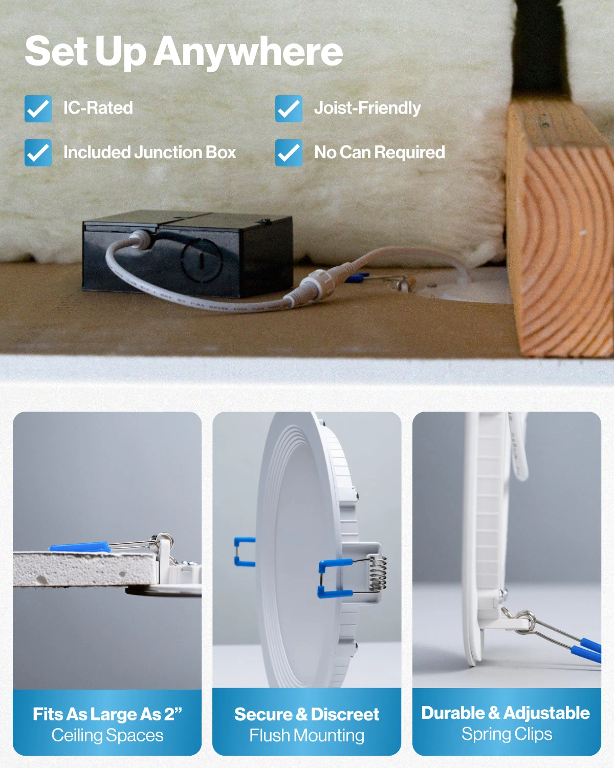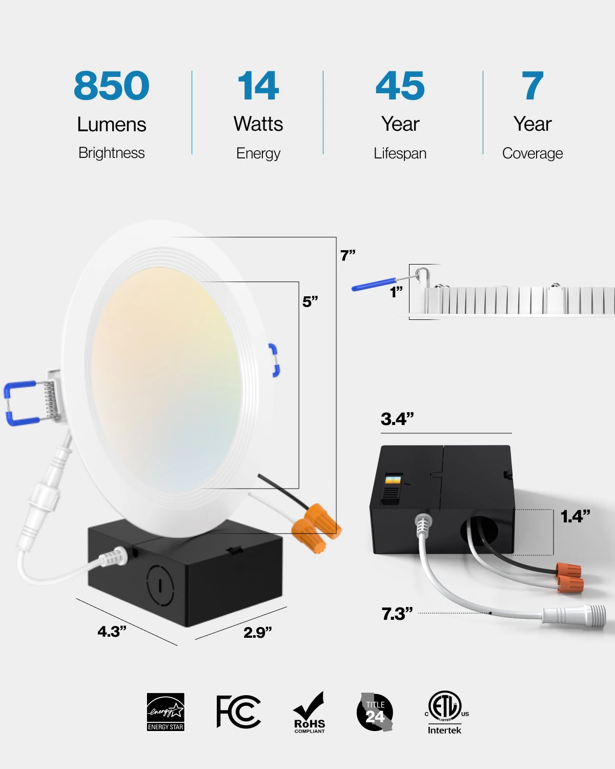 All in one package for easy install. Selectable color temperature. No can needed. IC rated for fire safety.