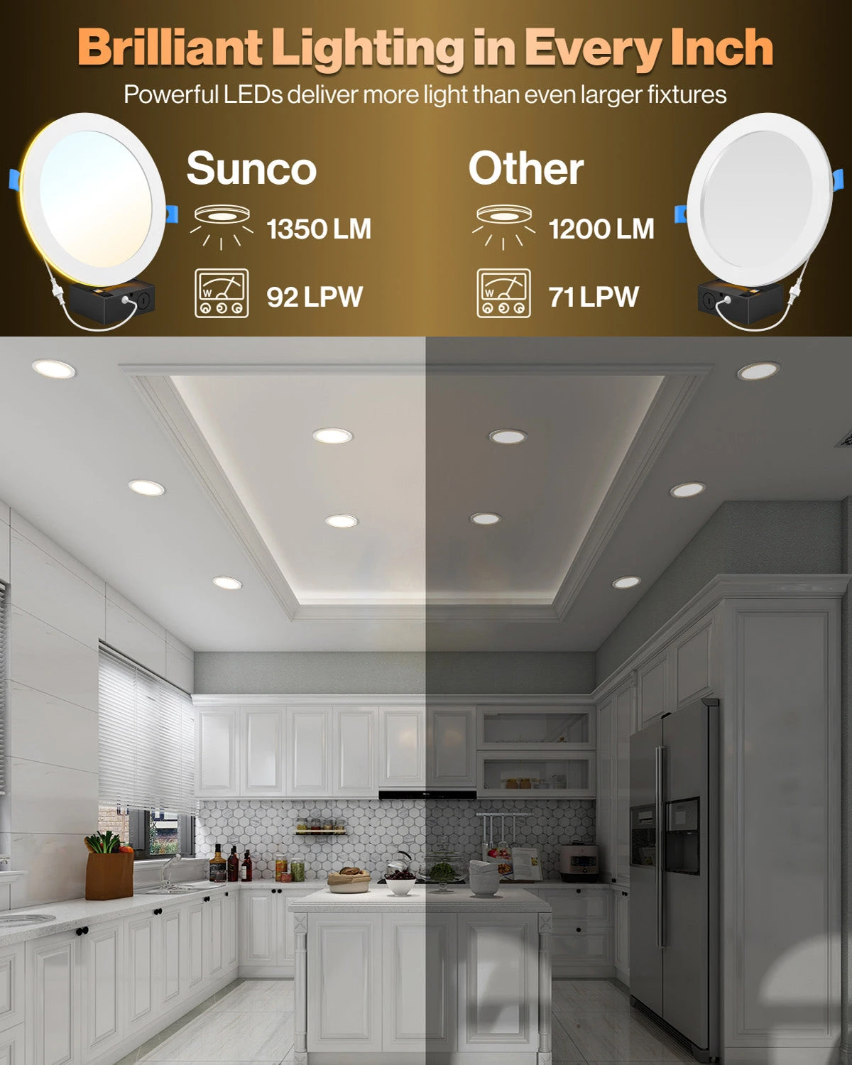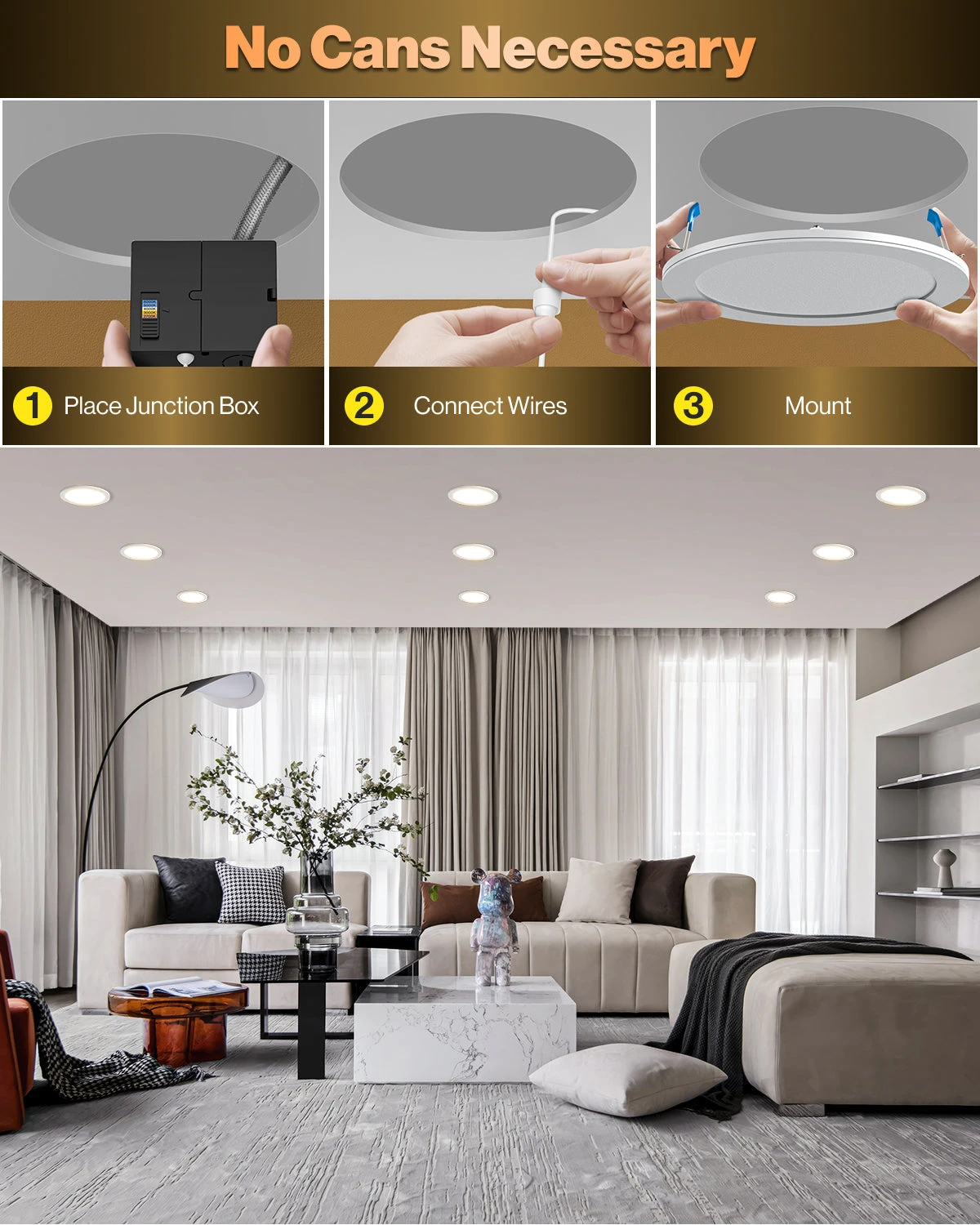 IC rated for fire safety. Fast install with all in one package. No can needed. Selectable Color Temperature. 8 inch recessed lighting kit.