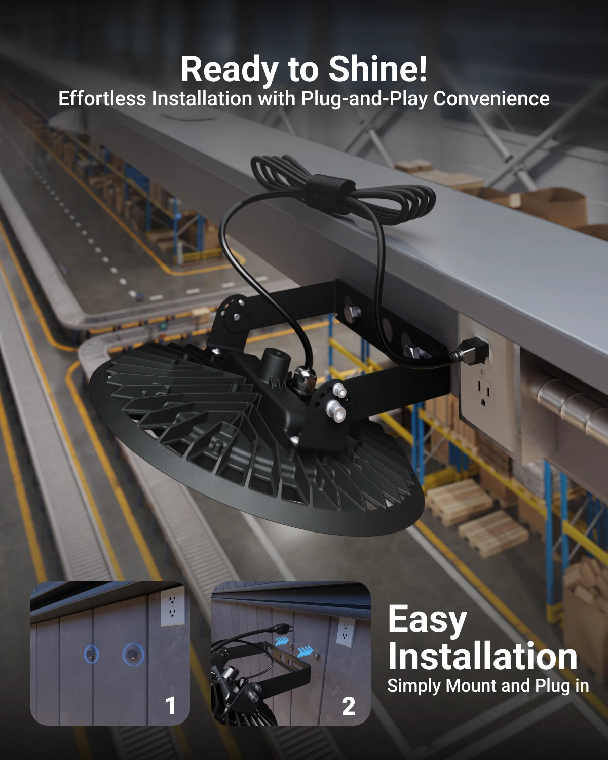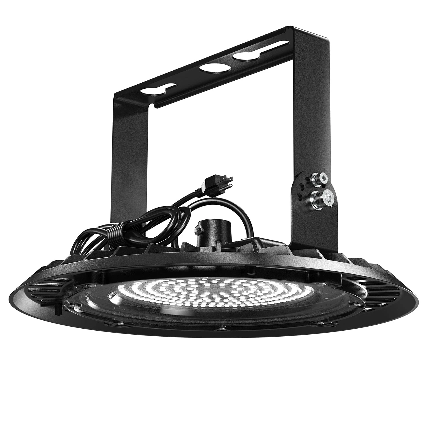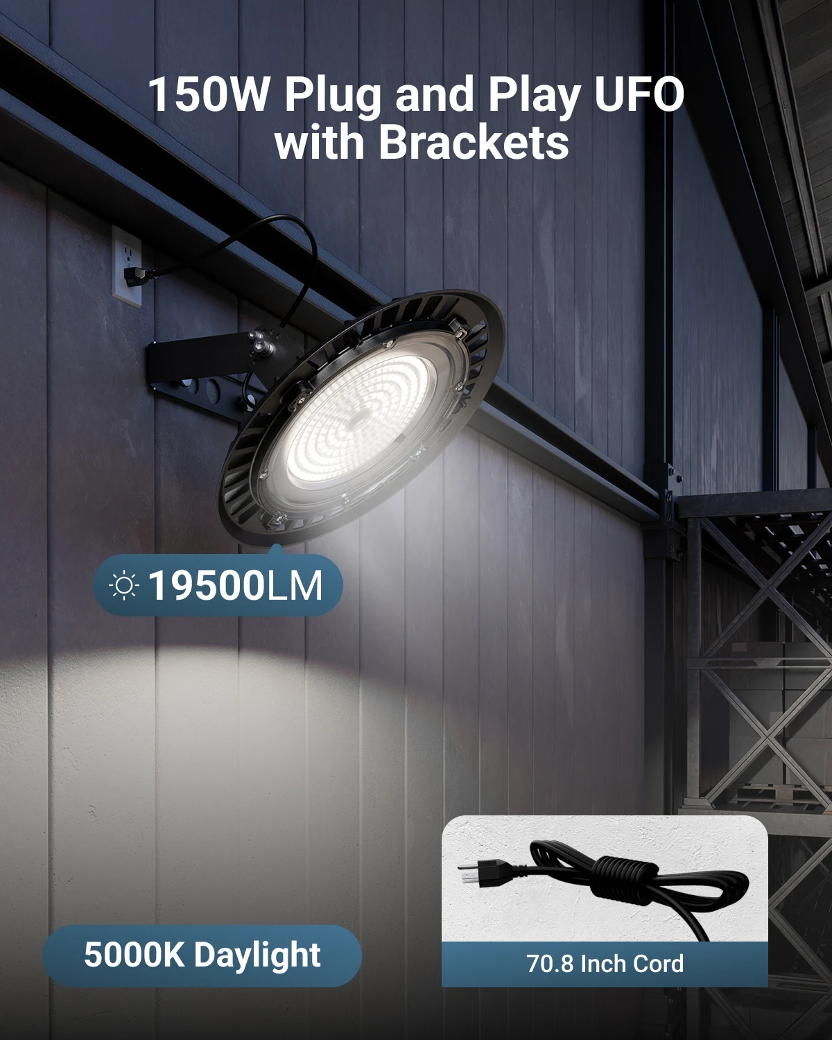 High Bay UFO Durable Indoor Modern Rust-Proof Commercial Industrial Warehouse U-Bracket Black Iron-Type Light, Plug & Play Lighting for Warehouse, 5000K Daylight, 150W, Power Cord Included, Lumens 120VAC, IP65 Waterproof Shatterproof Fixture UL Listed