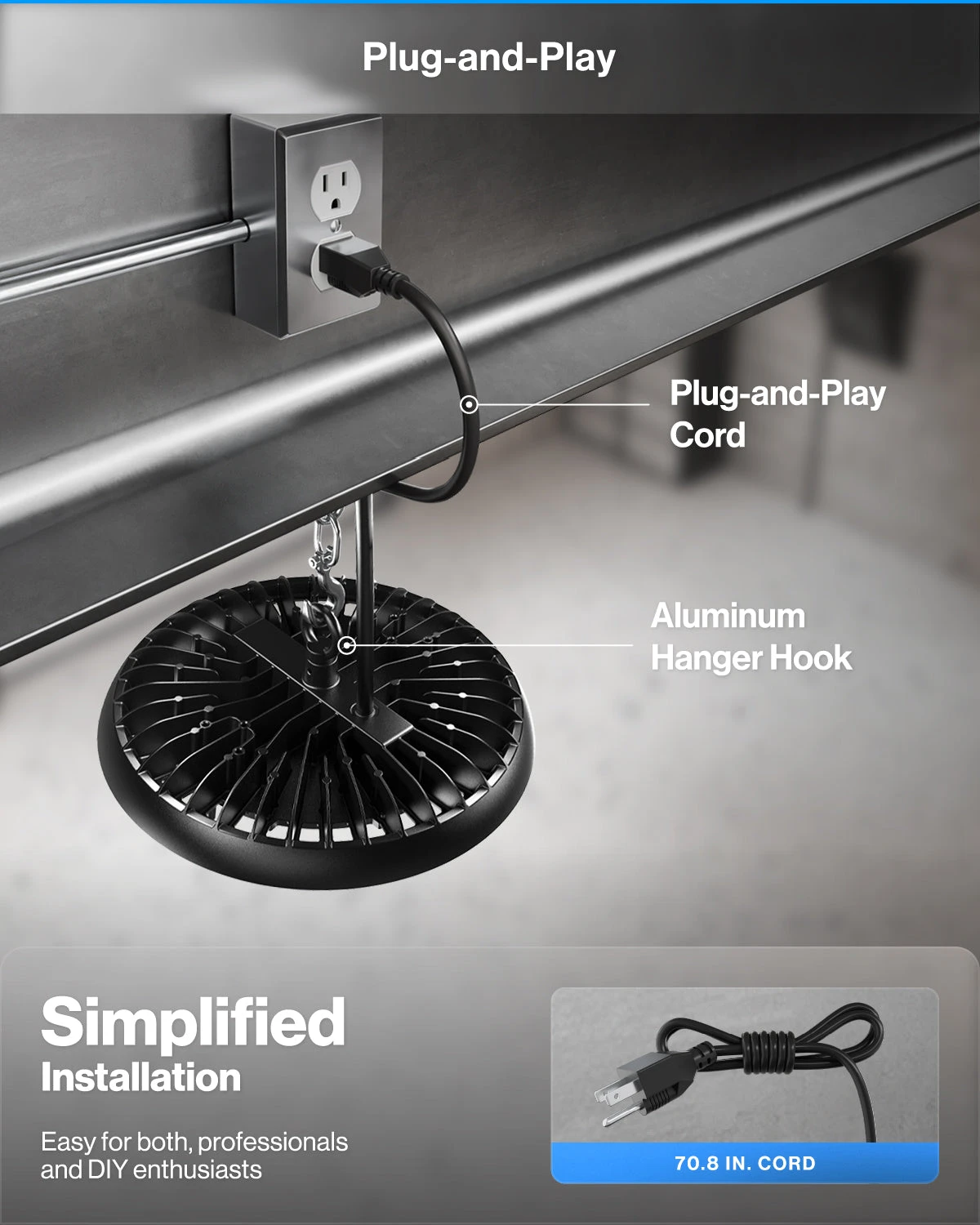 Easy install with mount options. Plug and Play for bright 280000lm ufo high bay light. IP65 rated.
